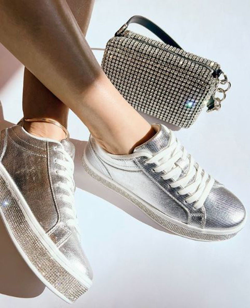 Stand out in style with the AERIE From Top MODA. These trendy flat platform sneakers will elevate your fashion game with crystals and rhinestone bling detail. Lace them up for a comfortable and chic look. Perfect for fashionistas and shoe lovers alike!