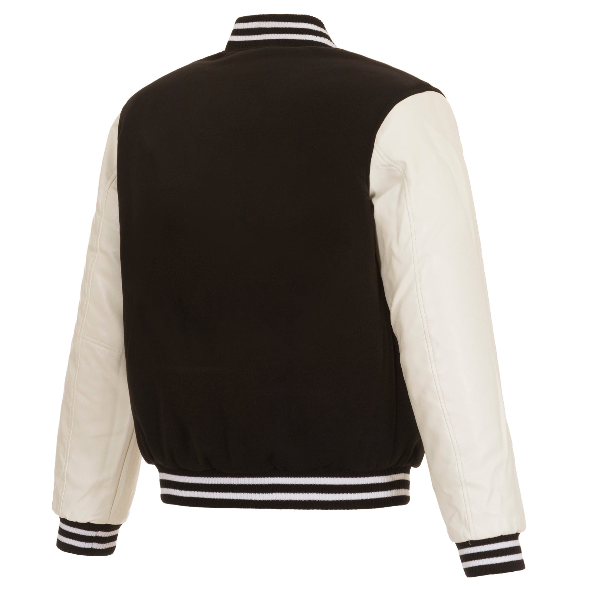 Anaheim Ducks reversible fleece jacket with faux leather sleeves in black and white with embroidered logos. Assembled in the USA. 100% Polyester body, faux leather sleeves, snap button closure.