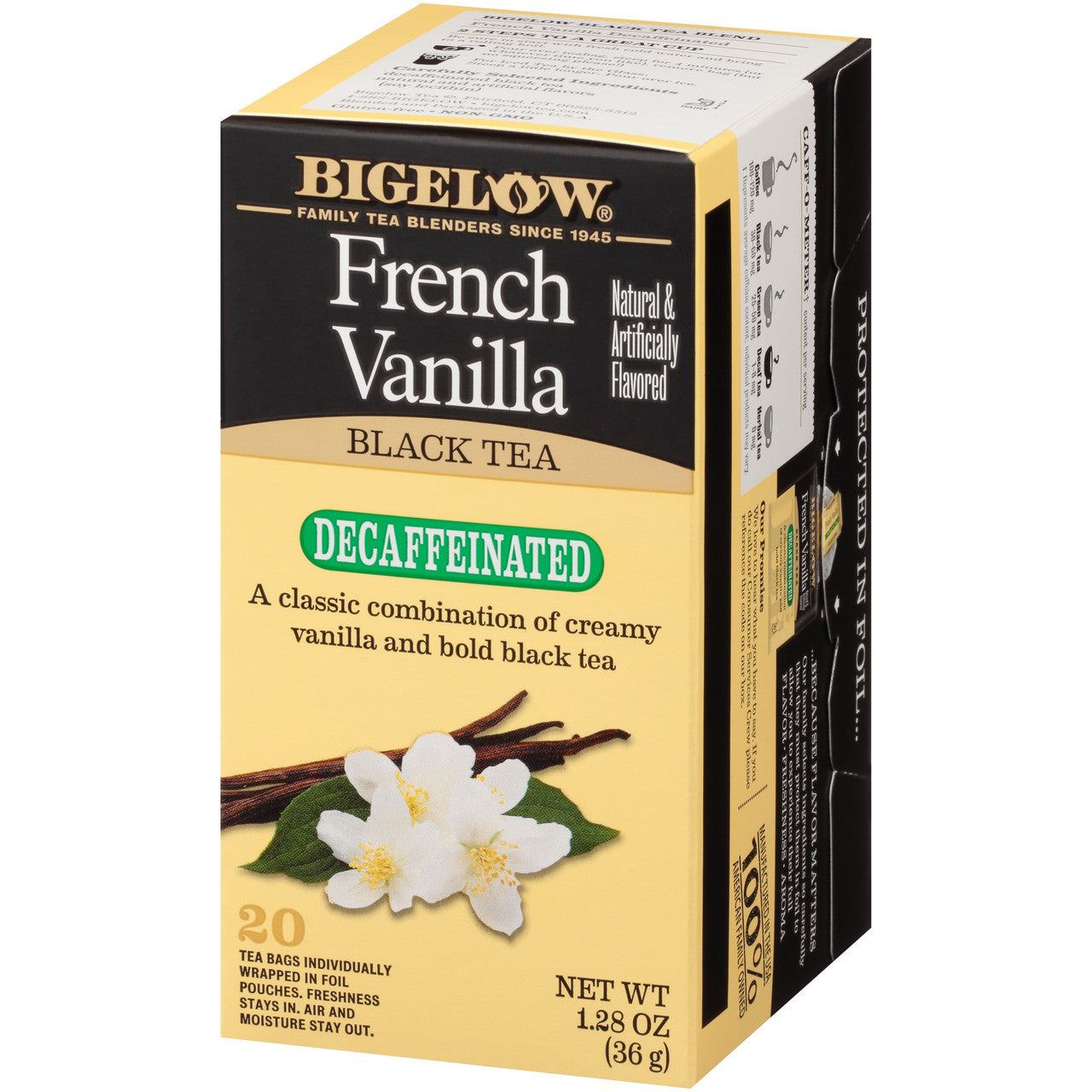 Enjoy Bigelow Decaffeinated French Vanilla Tea. Individual Fresh Pack. Tea With The Rich, Smooth Taste Of Vanilla. Natural & Artificially Flavored. Take Your Favorite Tea Wherever You Go! Bigelow's Individual Flavor-Protecting Envelopes Ensure Great Taste And Freshness. Experience More Than Just A Tea. The French Have Learned The Pleasure Of Taking Time For Themselves. We Invite You To Take A Private Moment To Relax And Unwind With A Delightful Cup Of Bigelow French Vanilla Decaffeinated Tea. Its Rich Vanilla Flavor Will Calm Down Even The Most Hectic Of Days And Because It Has No Calories And The Added Benefit Of Healthy Antioxidants, It's Good For You Too! Remember More Good Things Are What Every Lifestyle Needs. Blended And Packaged In The U.S.A. (Note: Description is informational only. Please refer to ingredients label on product prior to use and address any health questions to your Health Professional prior to use.