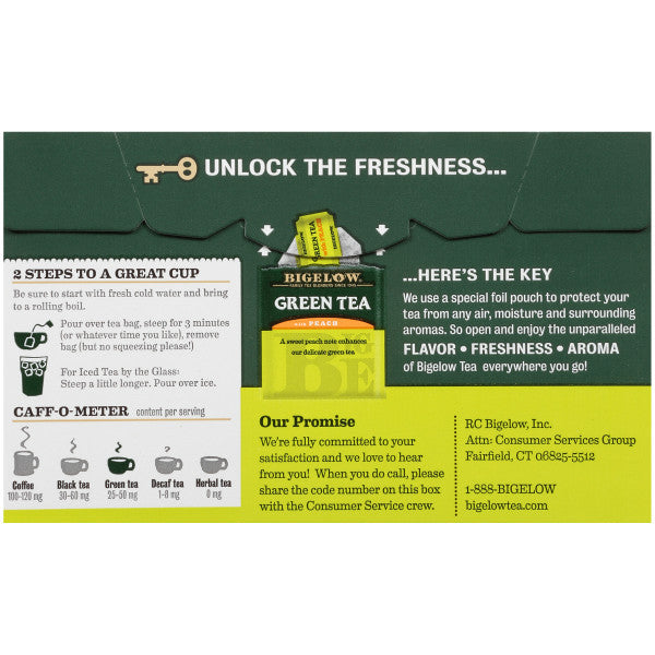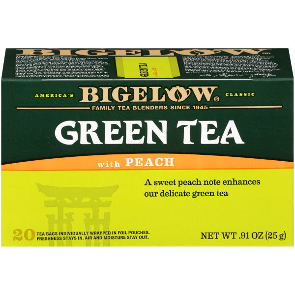 Enjoy Bigelow Green Tea with Peach (6x20 EA). The refreshing flavor of peach provides a fruity taste to the exotic flavor of green tea... so delicious. (Note: description is informational only. Please read product label prior to use and consult your health professional with any question prior to use.
