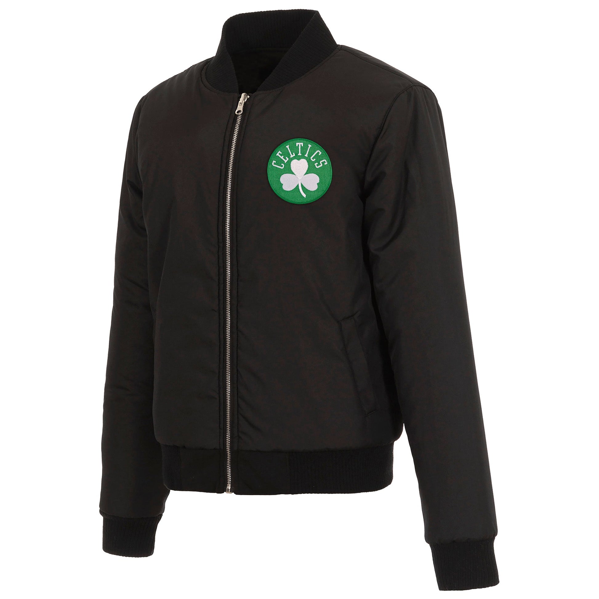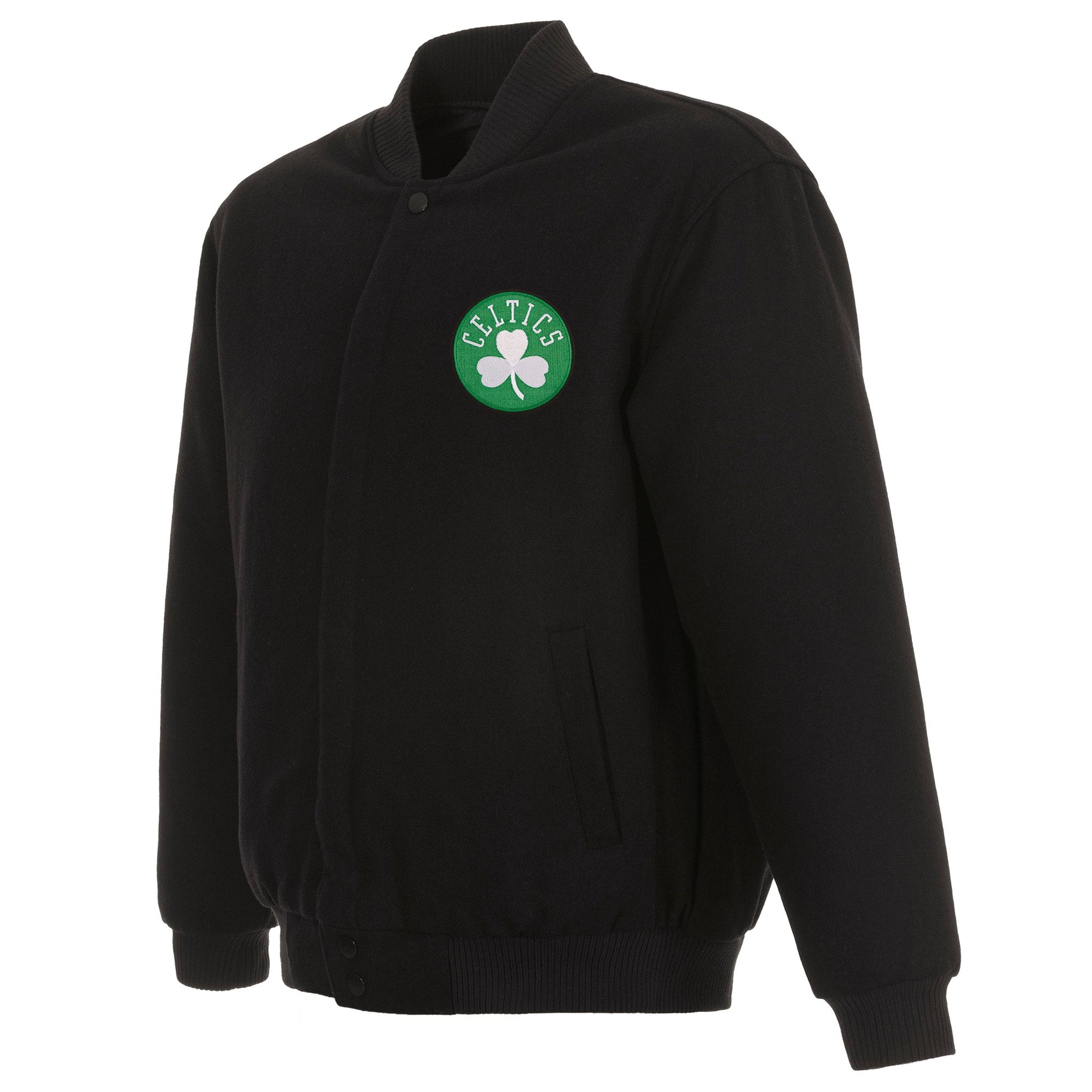Boston Celtics All Wool Jacket with nylon lining in black with embroidered logos. Assembled in the USA. 55% wool 45% polyester body. Snap button closure.