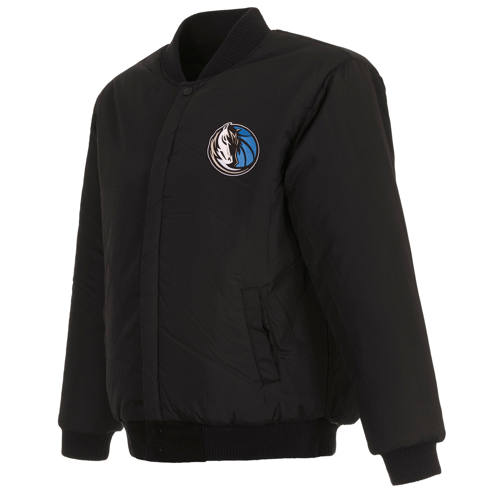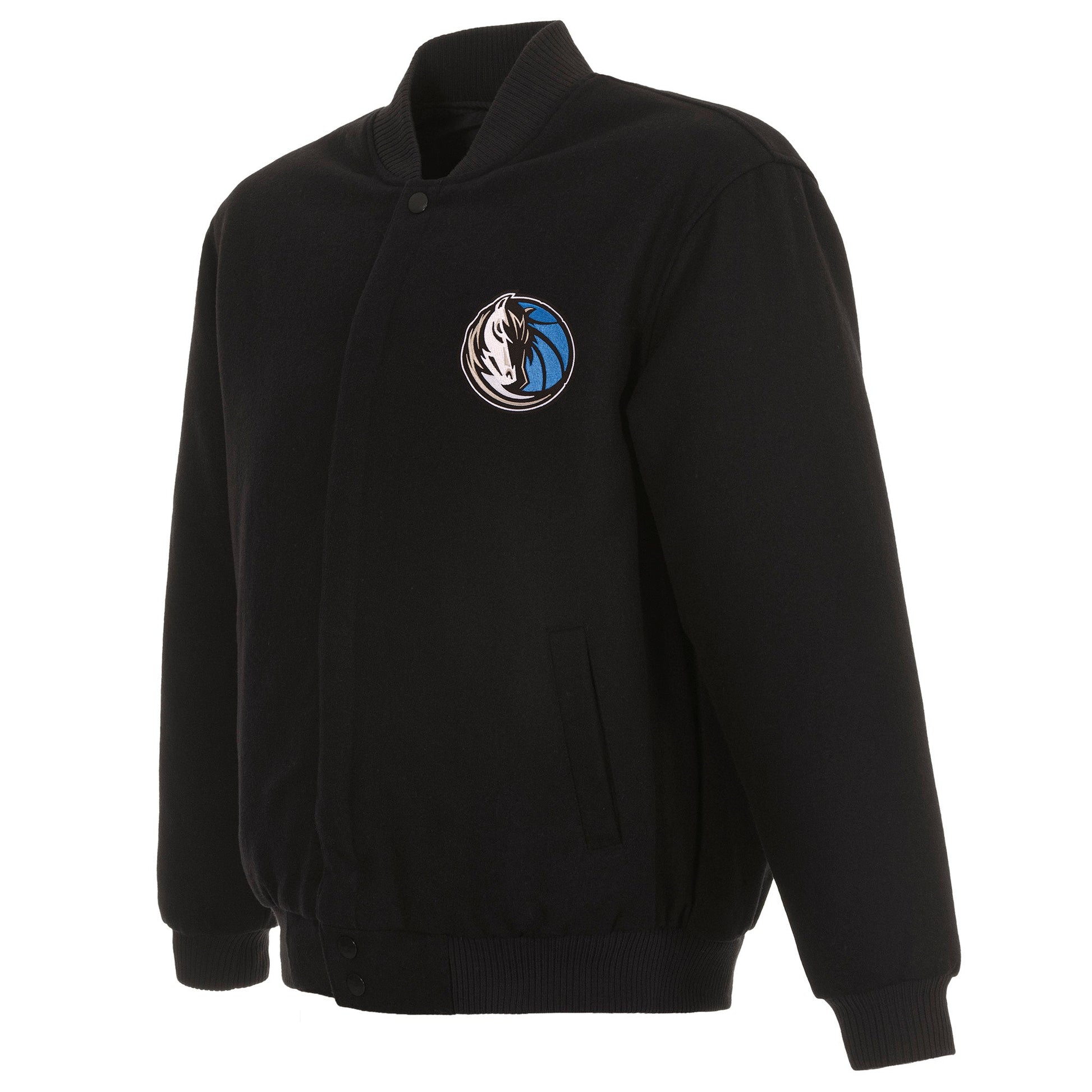 Dallas Mavericks All Wool Jacket with nylon lining in black with embroidered logos. Assembled in the USA. 55% wool 45% polyester body. Snap button closure.
