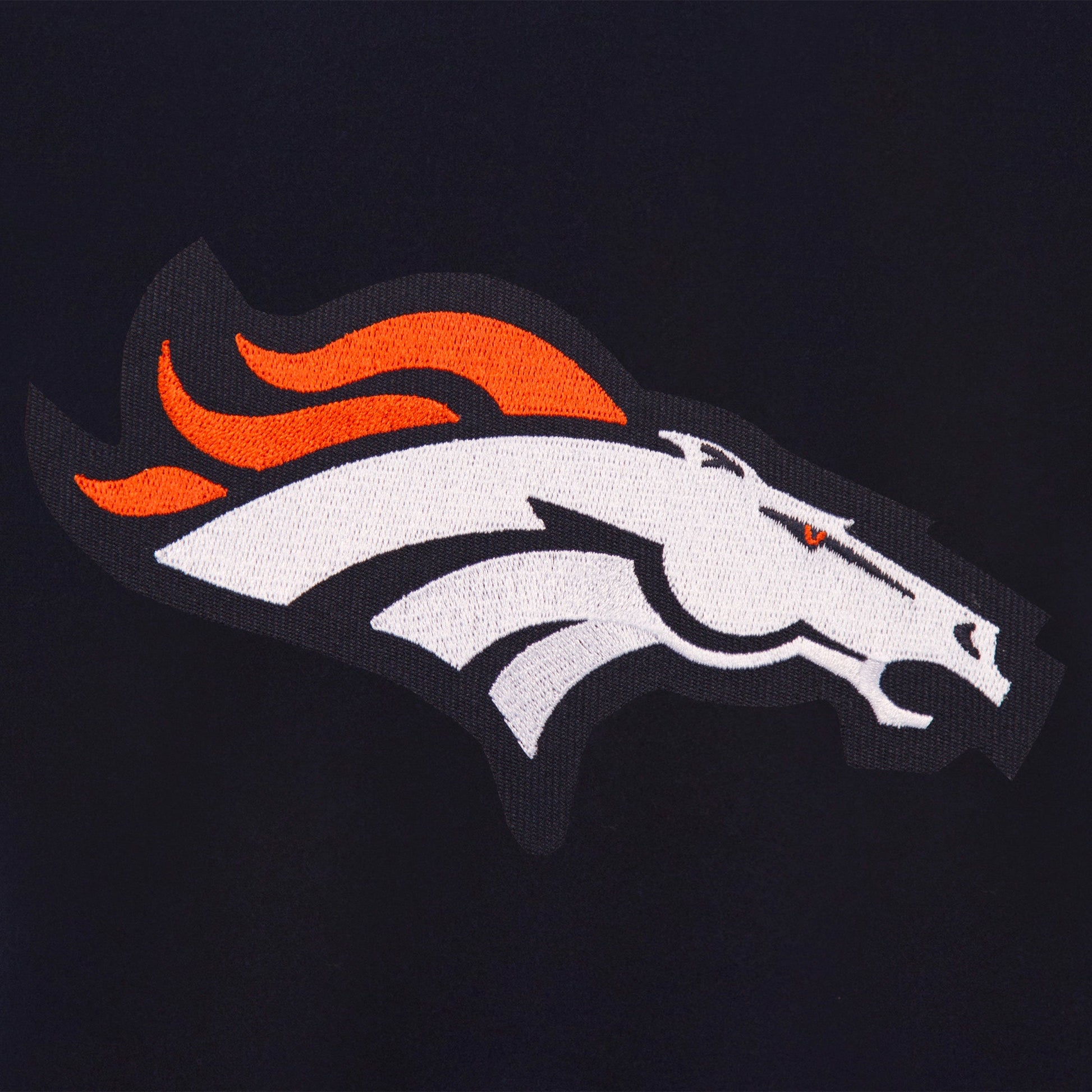 Denver Broncos all wool varsity jacket with quilted nylon lining in navy. Made in the USA. 55% wool 45% polyester body, traditional snap front closure.