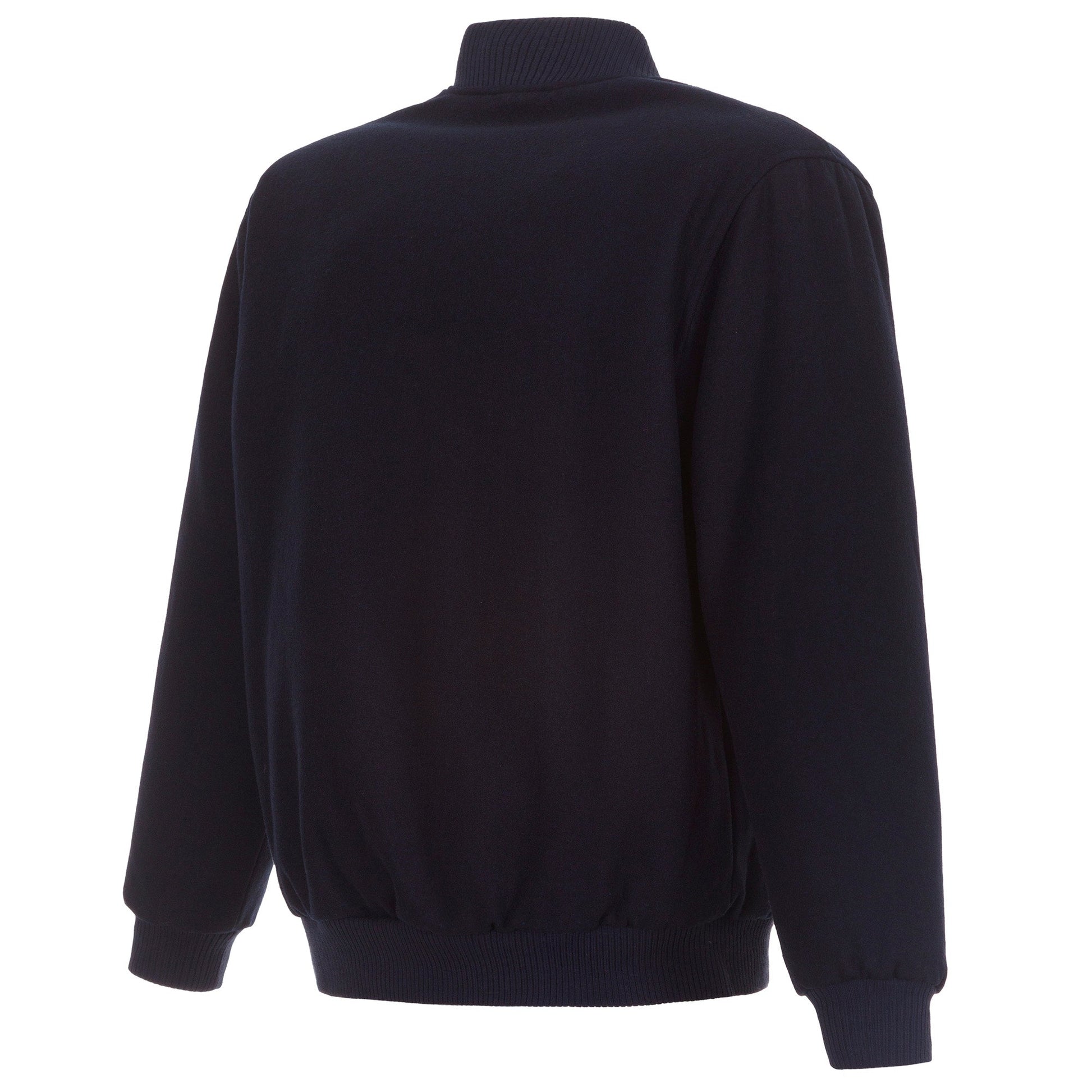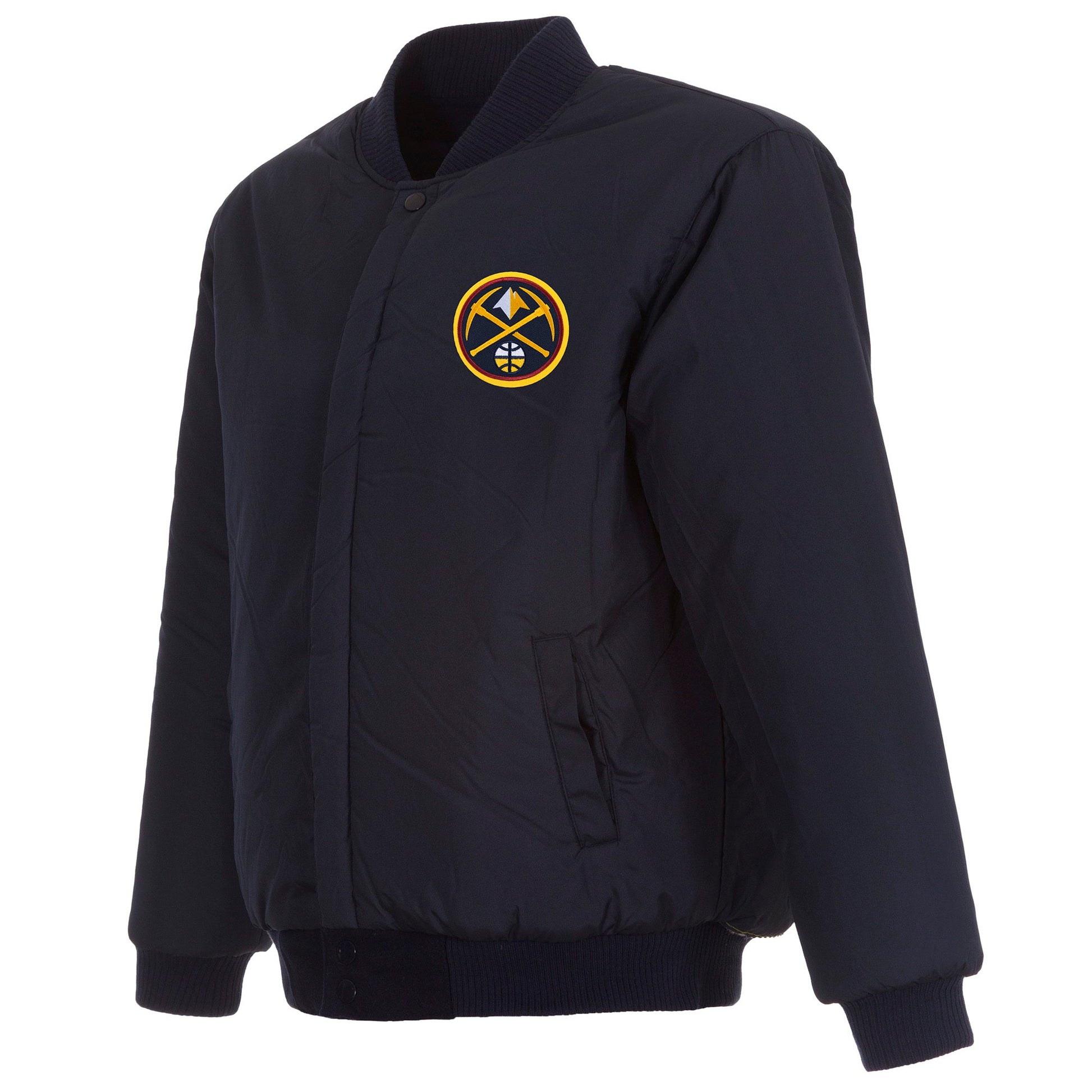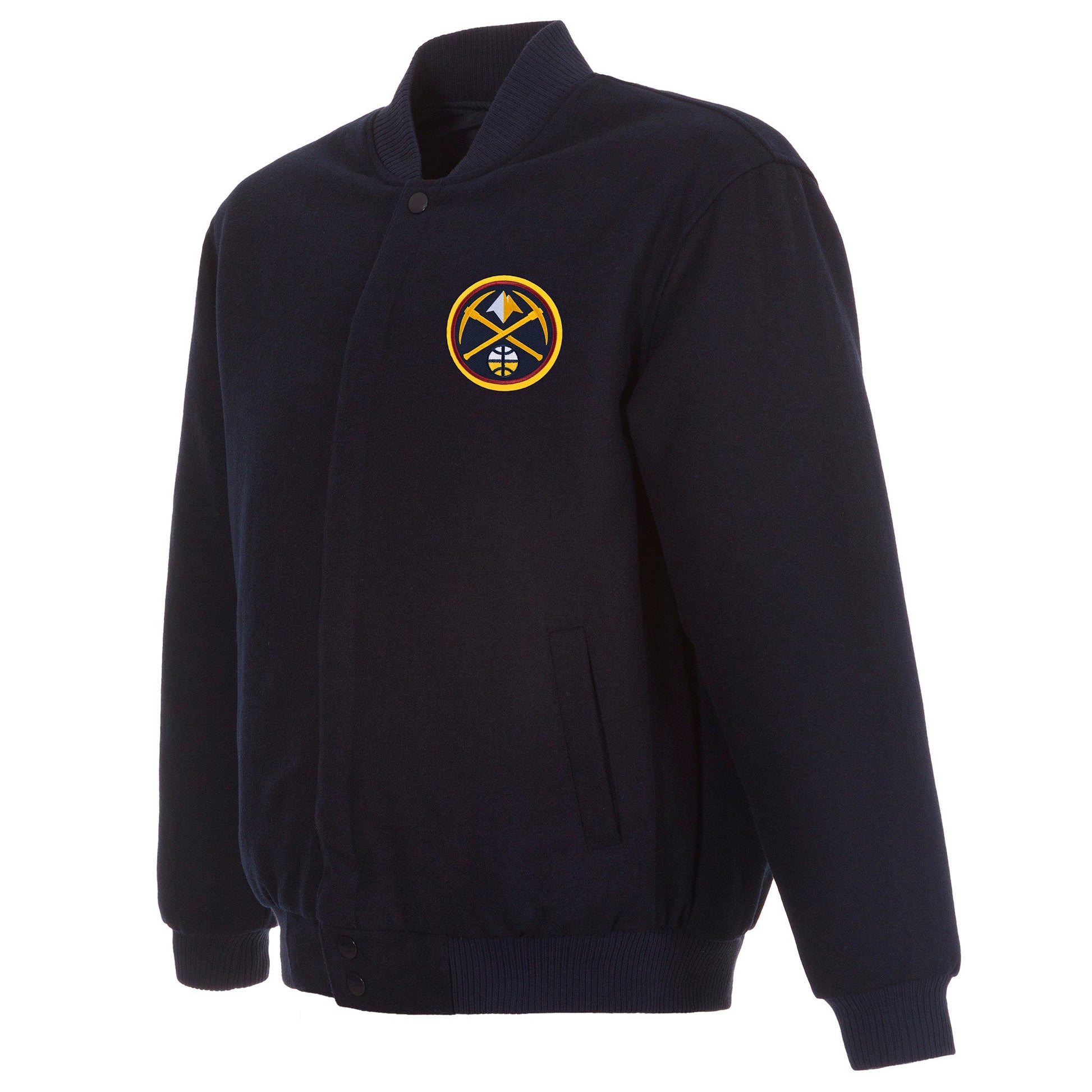 Denver Nuggets All Wool Jacket with nylon lining in navy with embroidered logos. Assembled in the USA. 55% wool 45% polyester body. Snap button closure.