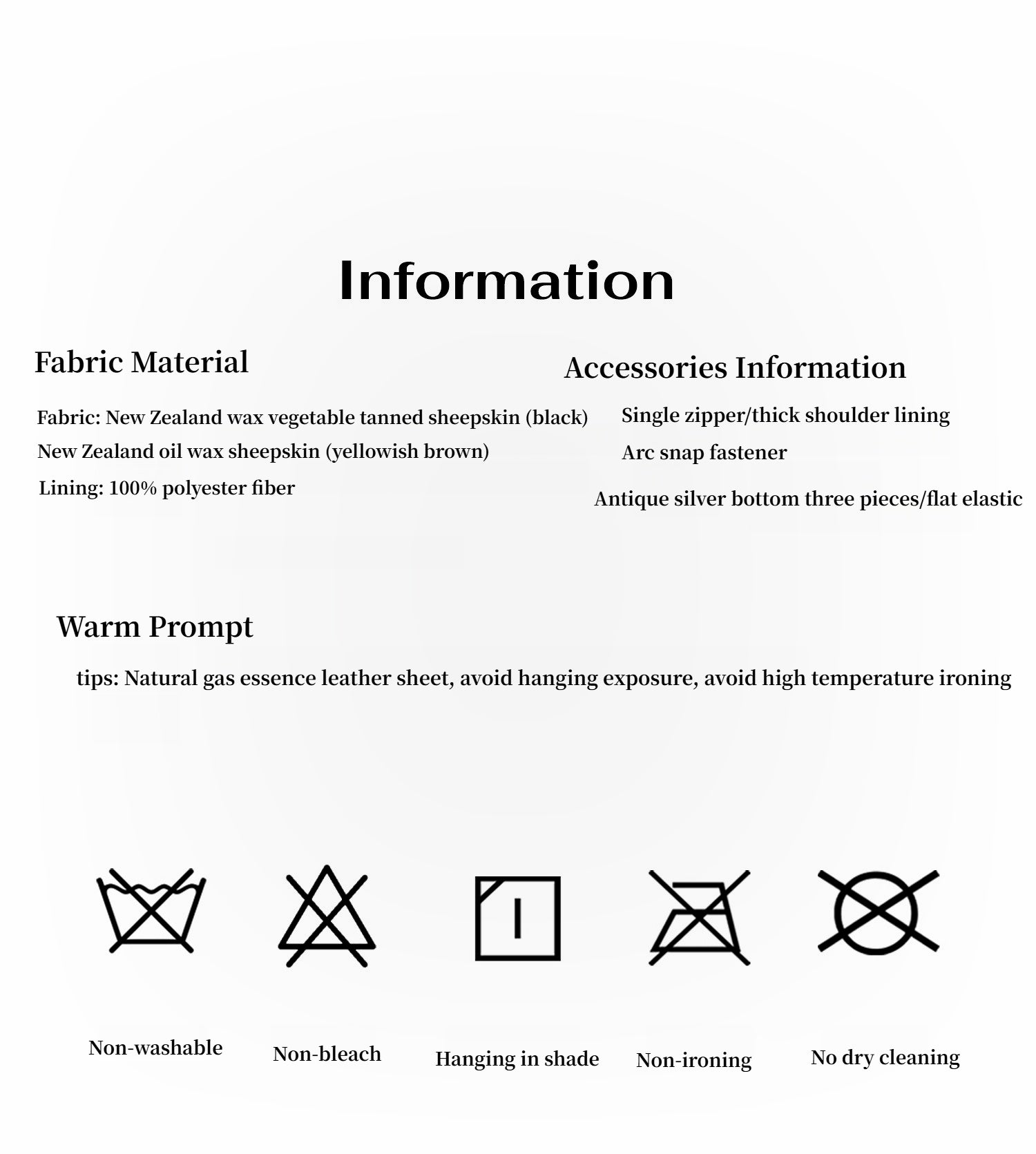 Grade A soft sheep leather is finished with a "waxy" finishing process, and the surface presents a natural oily patent leather with varying shades, a natural and soft luster, and a retro atmosphere. The leather is delicate and flexible, and it is not restrained when worn on the body.
