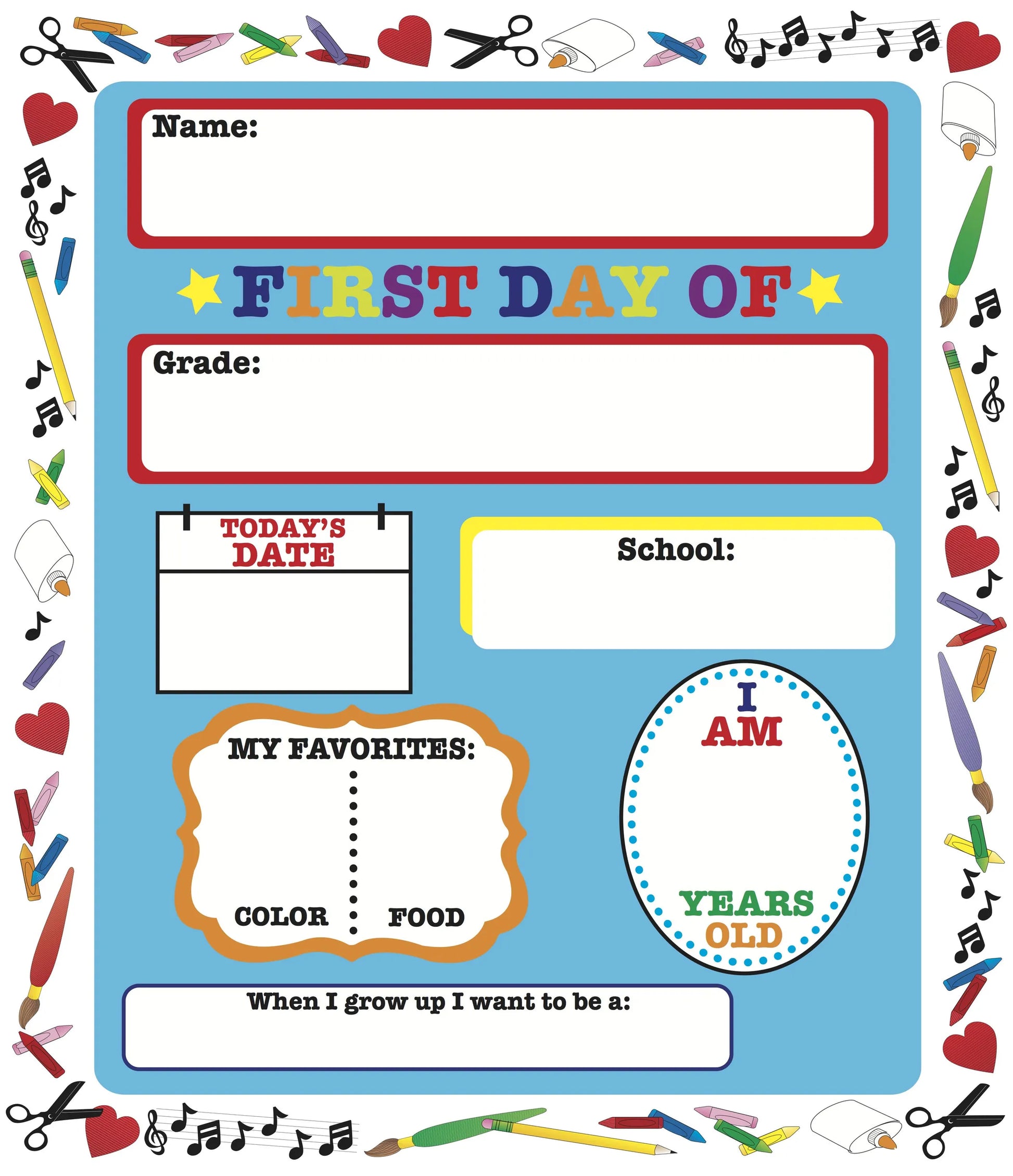 First Day of School Announcement (SE-877) is full color, 9x12.5, with fill in blanks. 15 per pack. All you need to do is take a picture of your child and the announcement to treasure the first day of school forever.