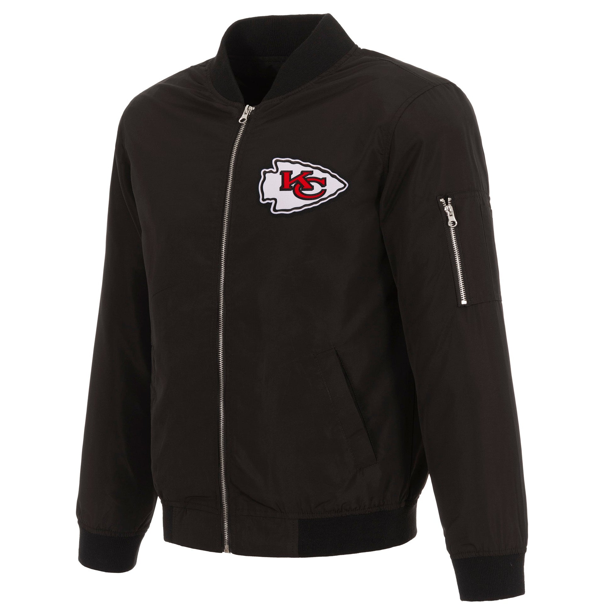 Kansas City Chiefs nylon bomber in black with embroidered logos. Assembled in the USA. 100% Nylon, full length zip front.