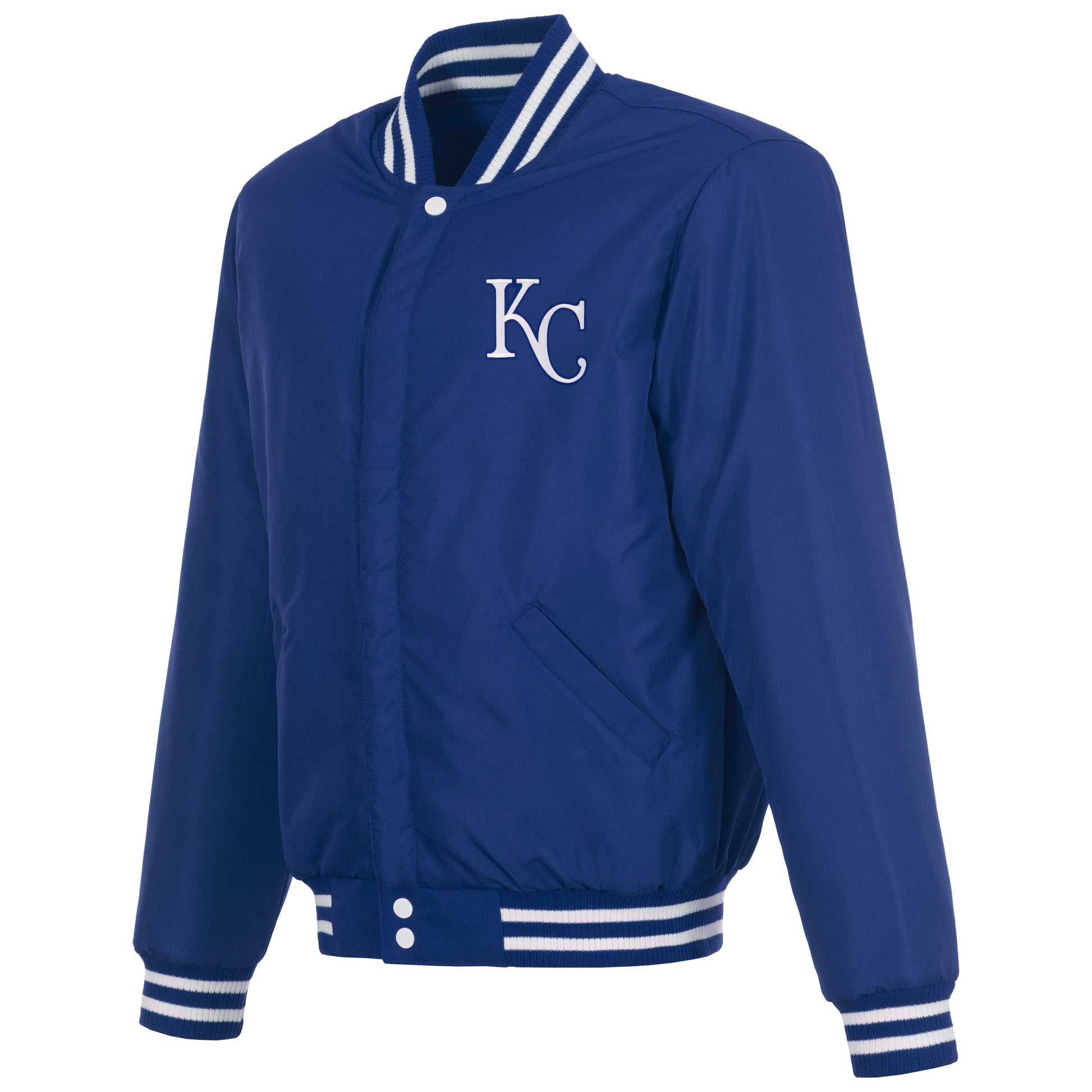 Kansas City Royals reversible fleece jacket with Faux Leather sleeves in royal and white with nylon lining and embroidered logos.