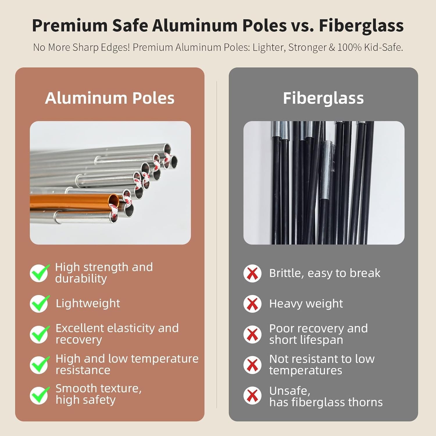 - Premium aluminum poles for safer, sturdier setup with quick assembly.