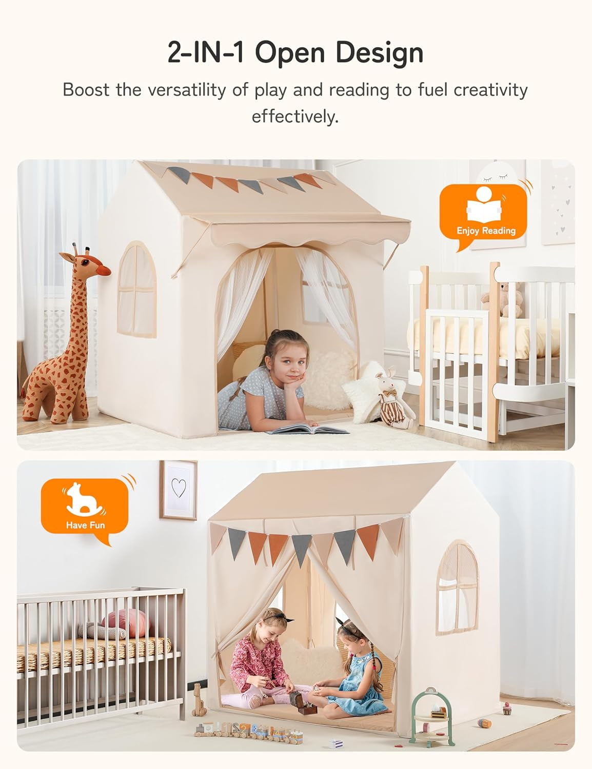 Unlock endless imagination with a 2-in-1 kids play tent that doubles as a cozy canopy bed tent. This charming eave-topped play tent invites kids to build worlds of pretend play, storytelling, and sleepovers, while adding a warm glow with string lights and playful bunting flags. With two entrances, every adventure starts with ease and ends with a smile.