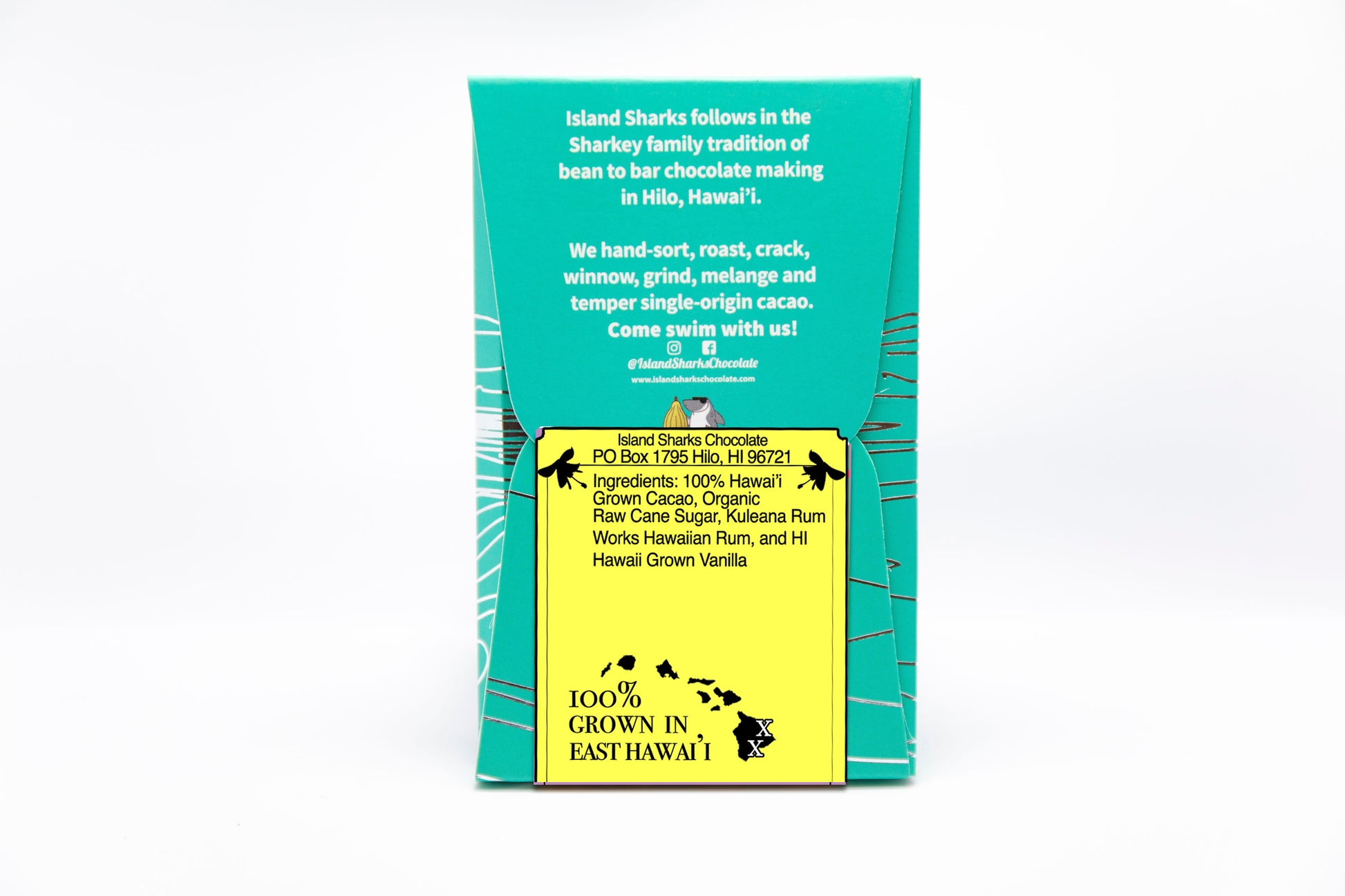 Kuleana Rum 71% Hawaiian Cacao Dark Chocolate w/ Vanilla is a collab of 2 local, small businesses. Island Sharks and Kuleana Rum Works have diligently dialed in these flavors to perfection after 3 years of production.