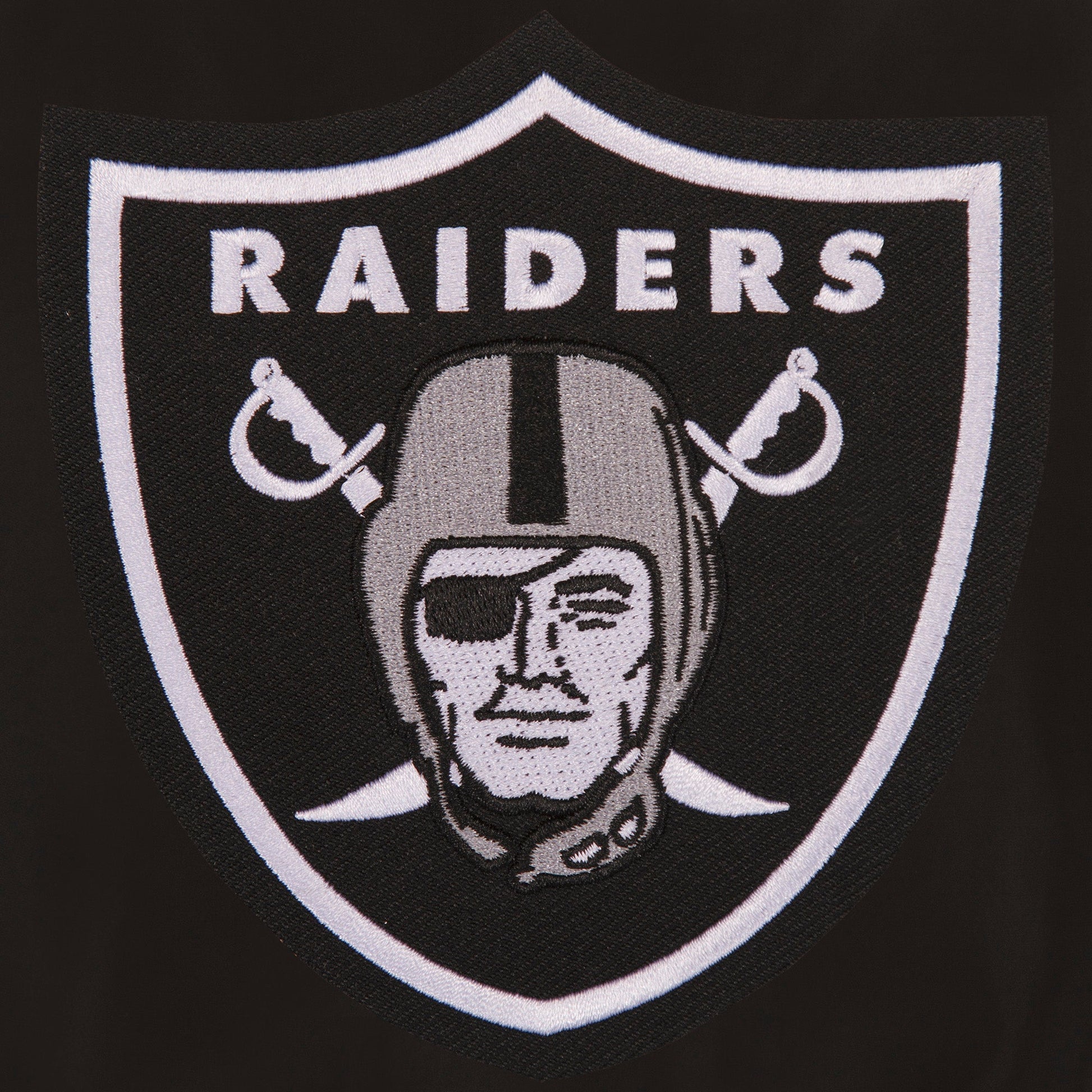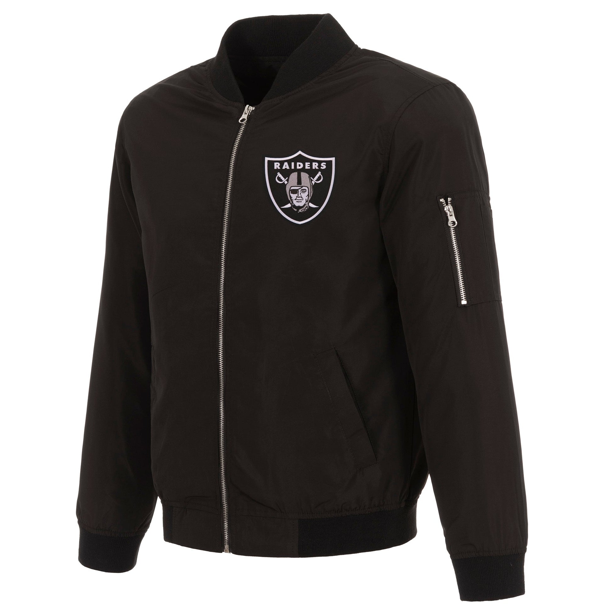 Las Vegas Raiders nylon bomber in black with embroidered logos. Assembled in the USA. 100% Nylon, full length zip front.