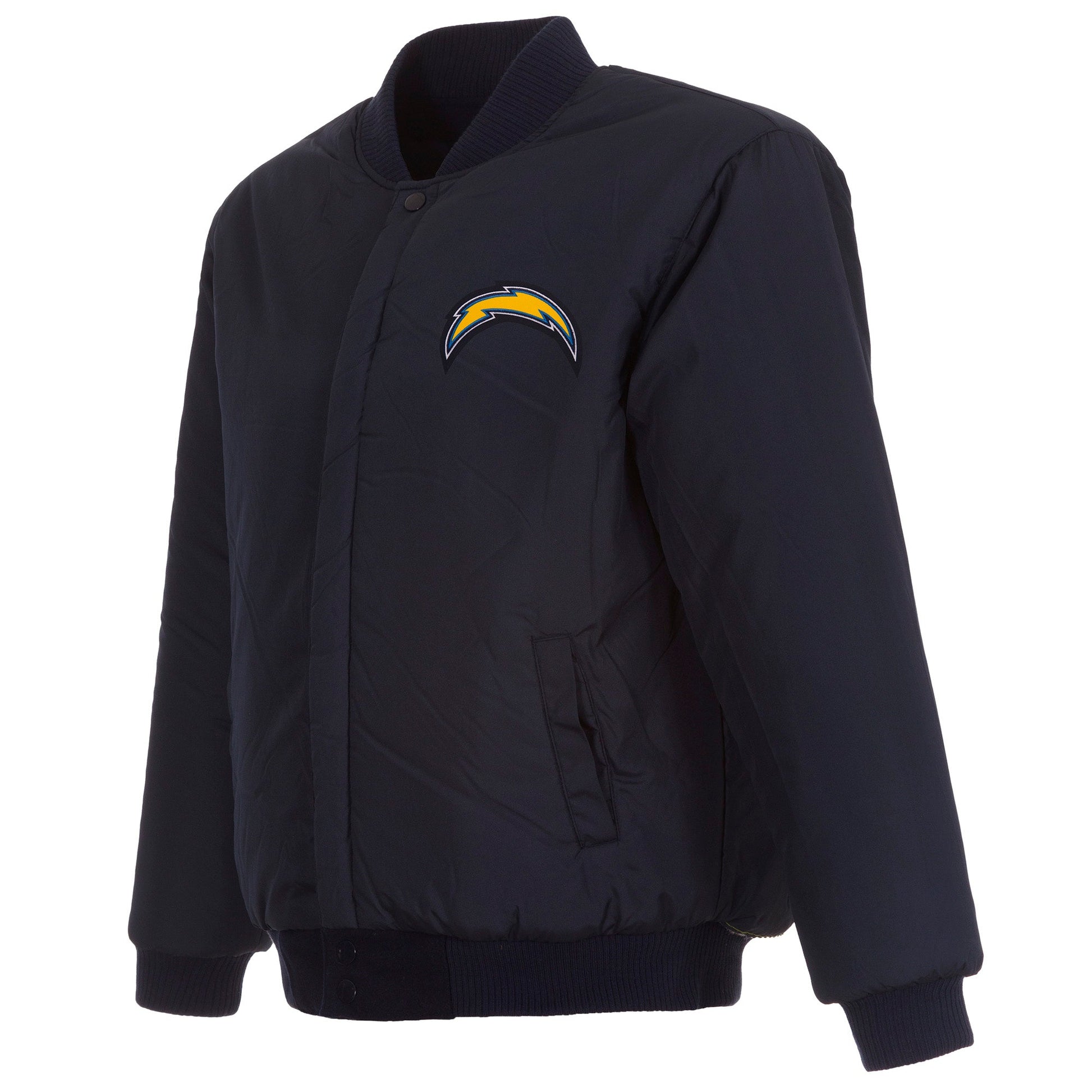 Los Angeles Chargers All Wool Jacket with nylon lining in navy with embroidered logos. Assembled in the USA. 55% wool 45% polyester body. Snap button closure.