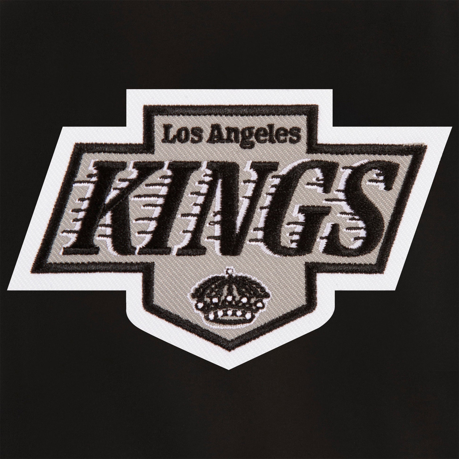 Los Angeles Kings All Wool Jacket with nylon lining in black with embroidered logos. Assembled in the USA. 55% wool 45% polyester body. Snap button closure.