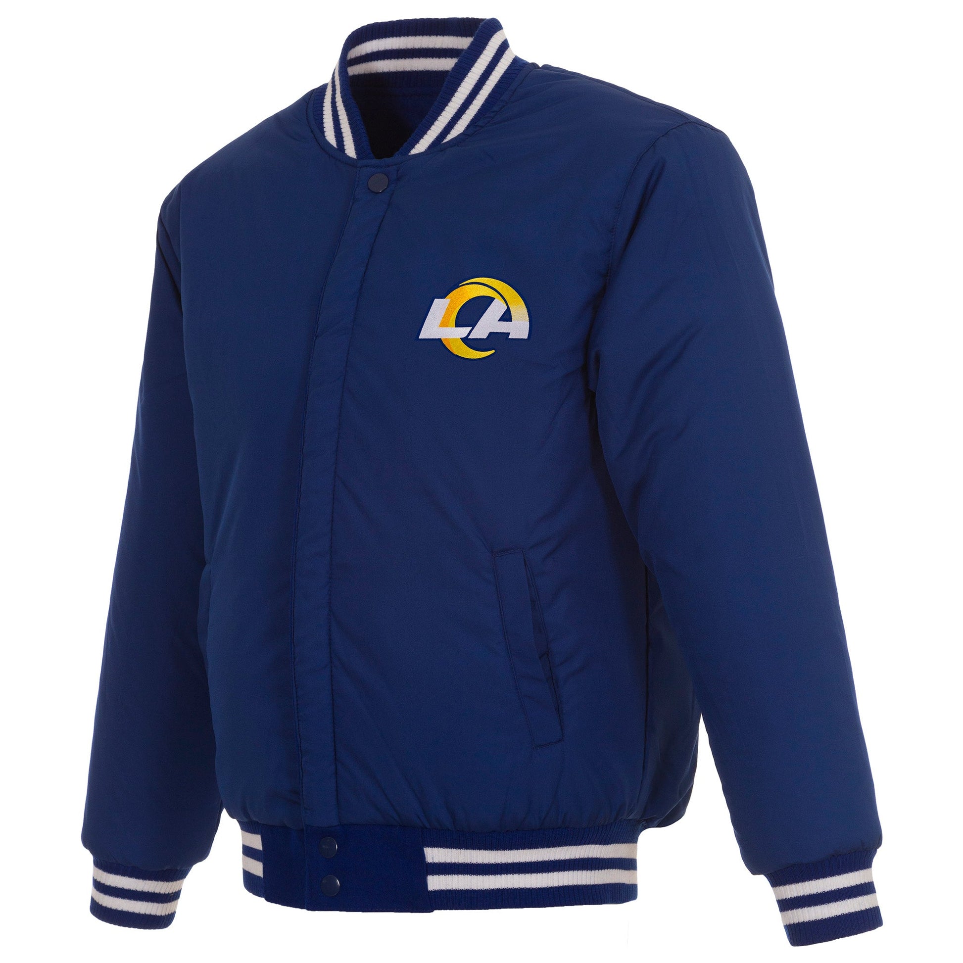 Los Angeles Rams all-wool reversible jacket in royal with nylon lining and embroidered appliqué patches.