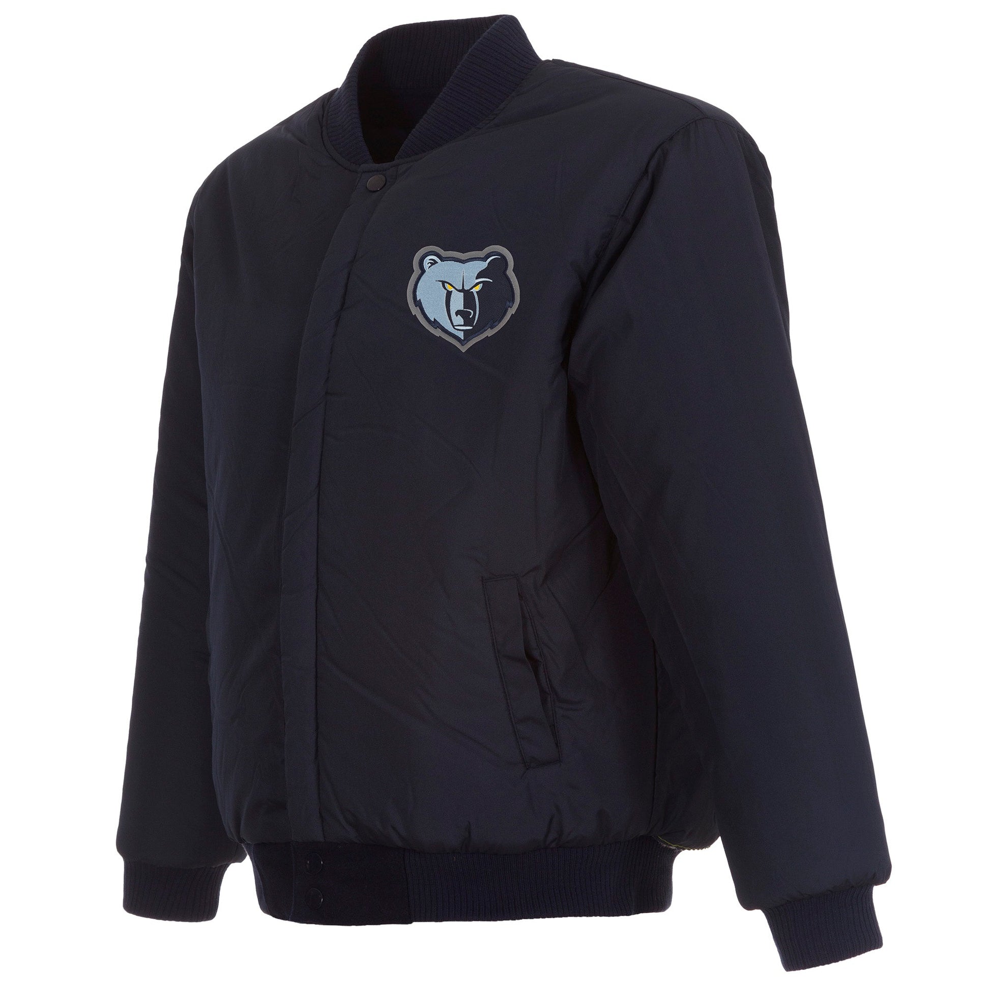 Memphis Grizzlies All Wool Jacket with nylon lining in navy and red with embroidered logos. Assembled in the USA. 55% wool 45% polyester body. Snap button closure.