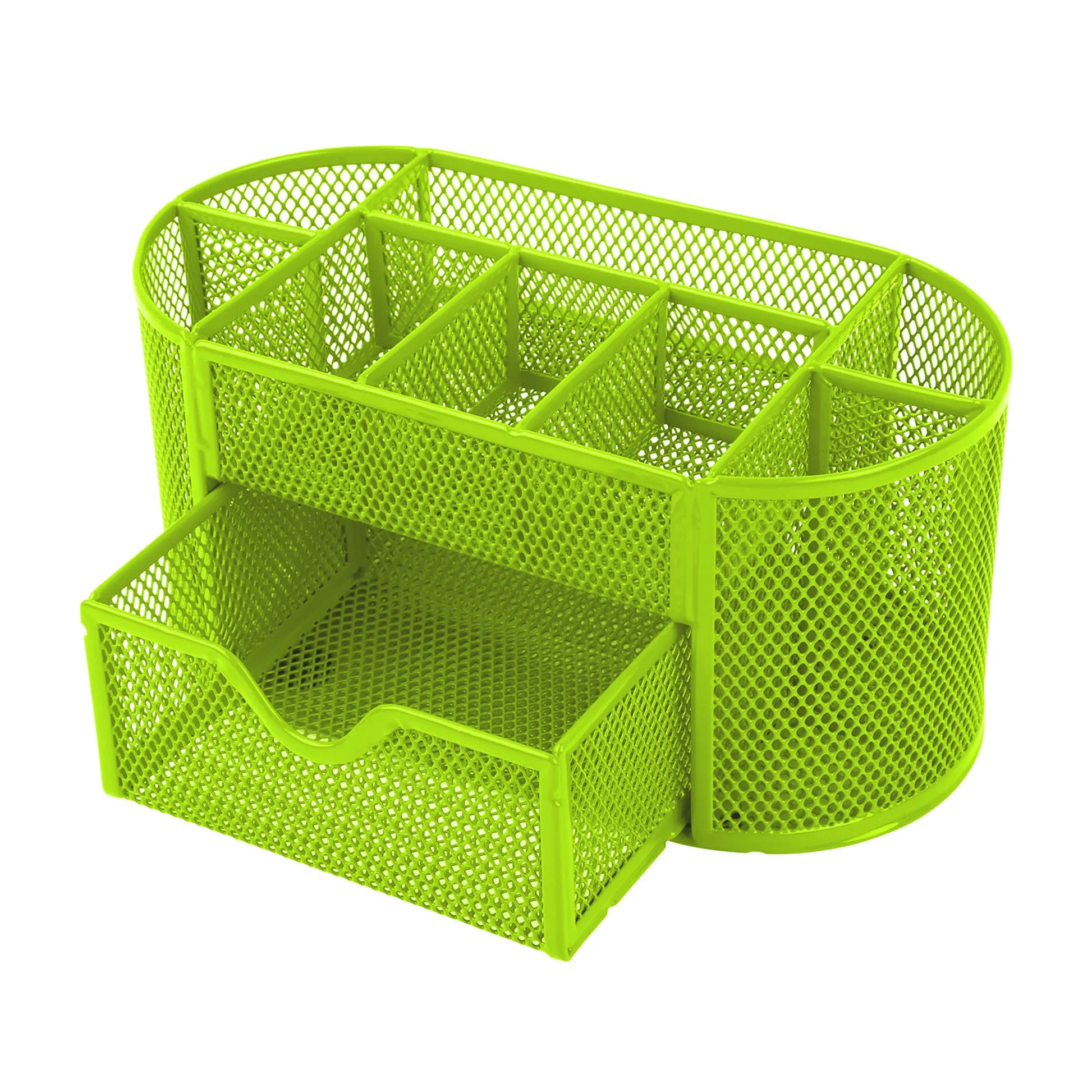 Our office desk organizer has enough space to hold your various stationeries and writing instruments. It comes with 4 pencil side cups for highlighters, pencils, pens, and sharpies, 4 additional square shallow compartments on top for thumbtacks, paper clips and sticky notes, and 1 individual supply drawer. Even it has EVA plastic materiel grips on the end that prevent it from sliding all over your desk.