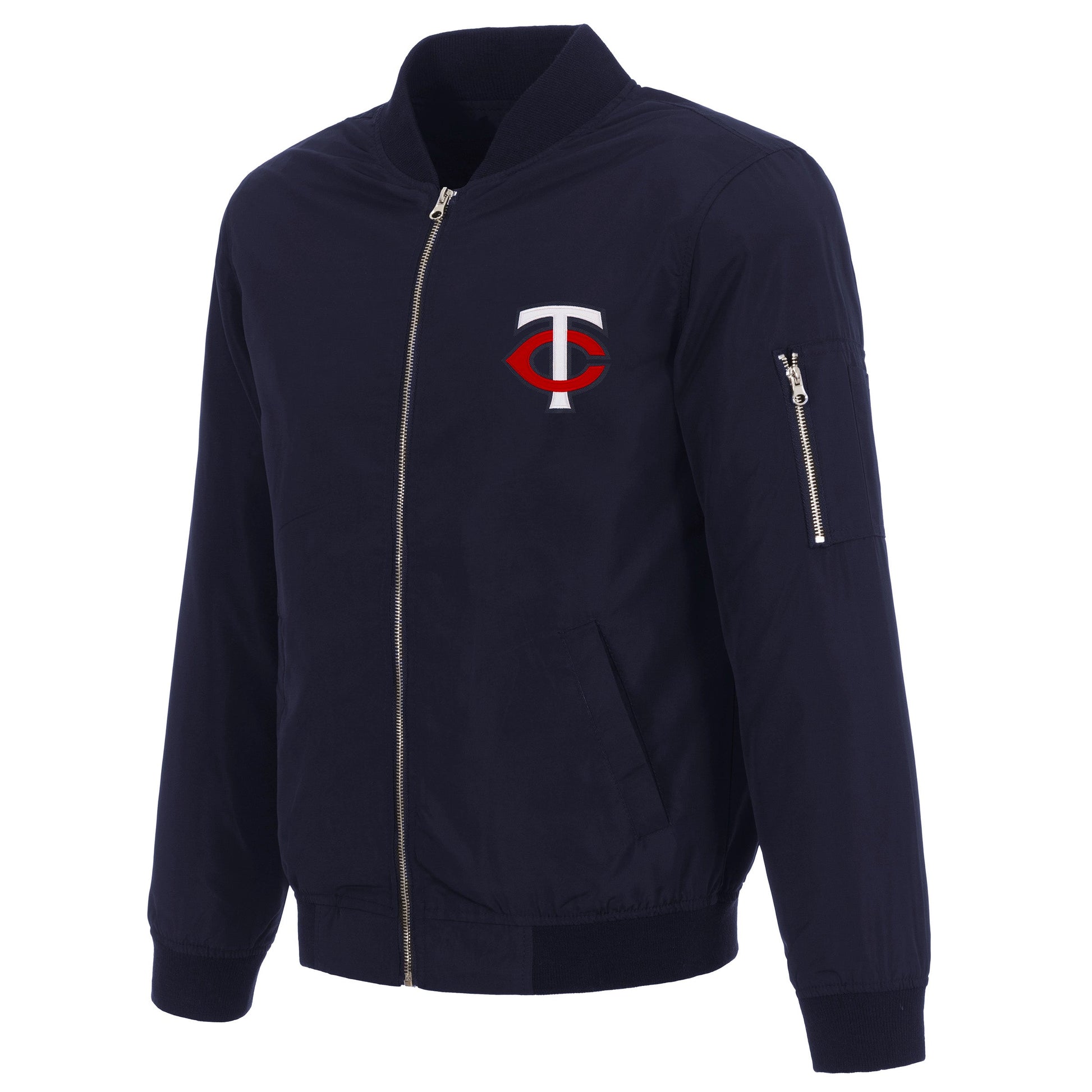 Minnesota Twins nylon bomber in navy with embroidered logos.