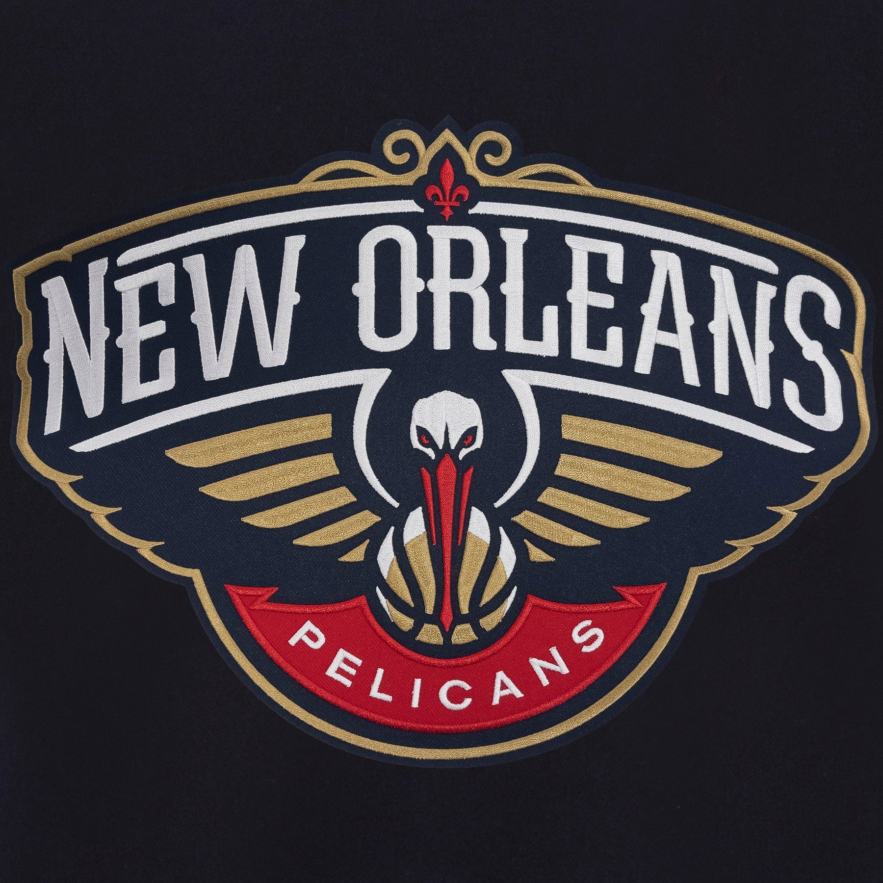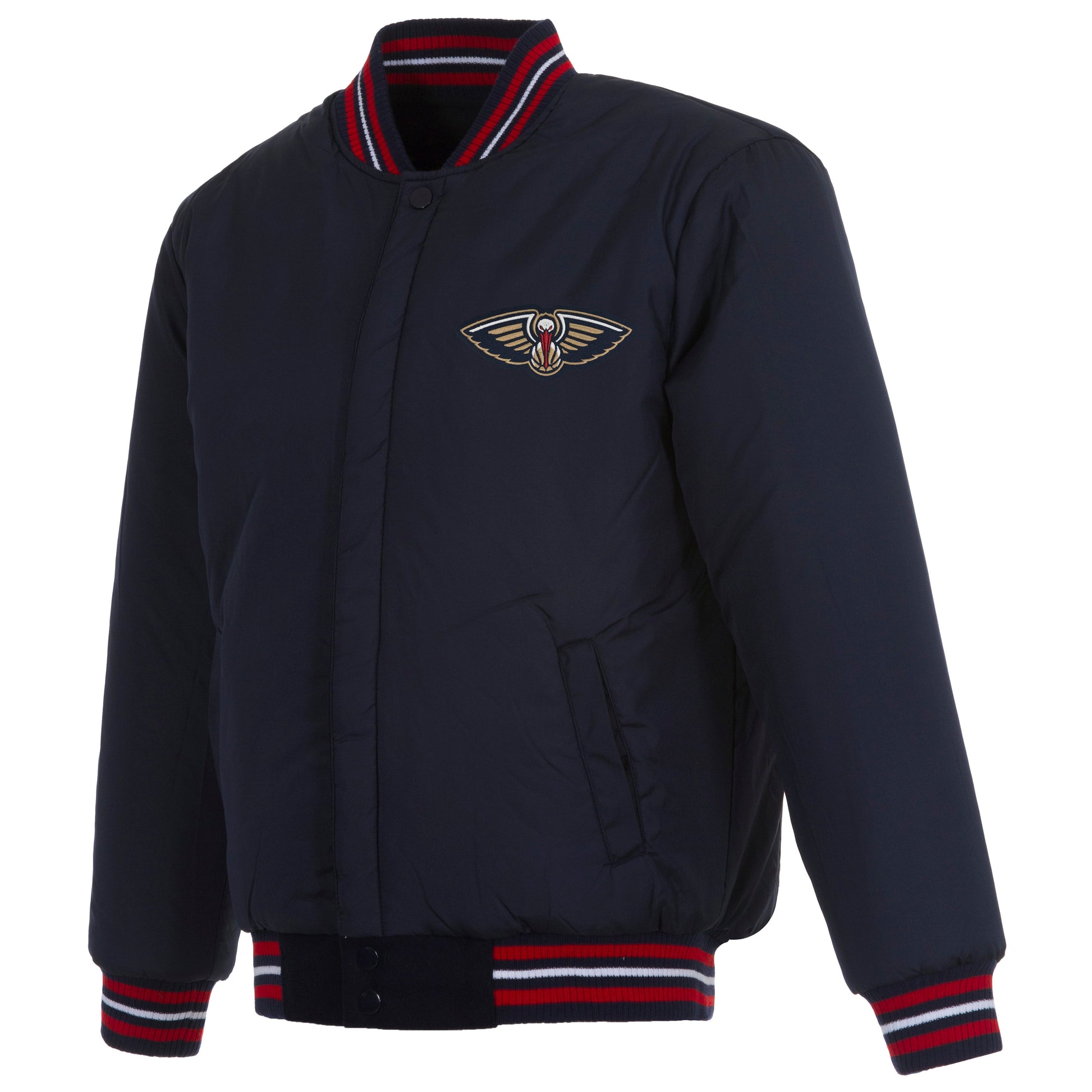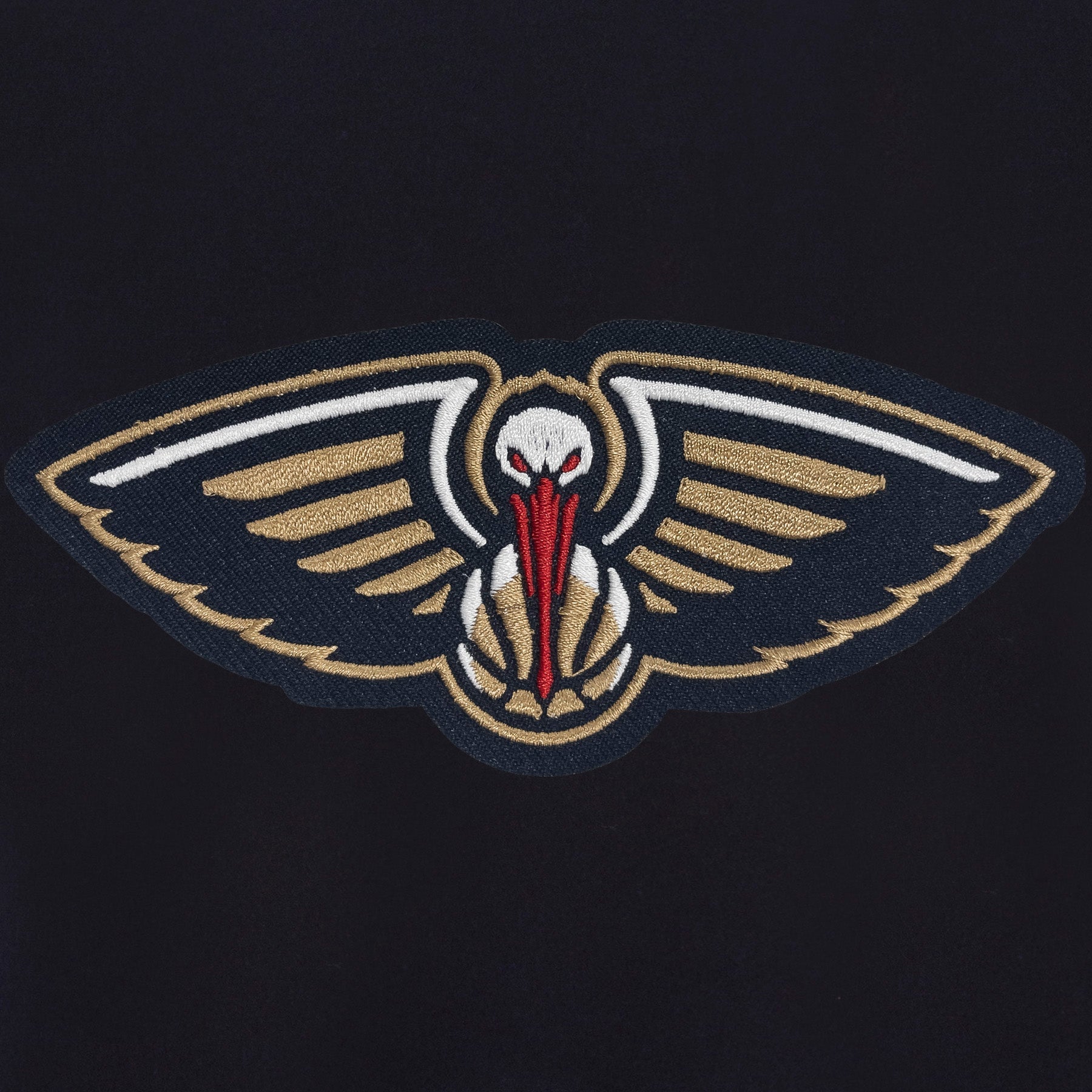New Orleans Pelicans All Wool Jacket with nylon lining in navy and red with embroidered logos. Assembled in the USA. 55% wool 45% polyester body. Snap button closure.