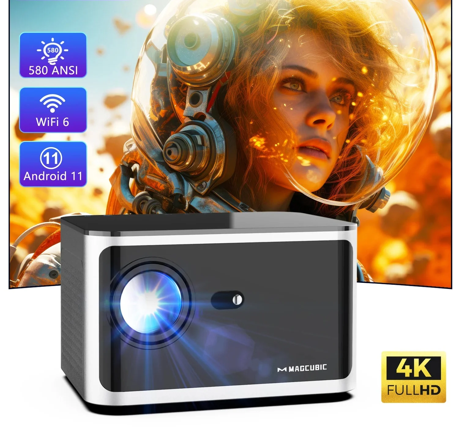 Elevate your home entertainment with this Android 11 Smart Projector, engineered for smooth performance and stunning clarity. Featuring 580 ANSI brightness, native 1080P resolution, and support for 4K video sources, it delivers sharp, vibrant images that transform any room into a personal cinema. With a massive projection size of up to 150 inches, it offers an immersive, theater-quality experience for movies, gaming, sports, and more.