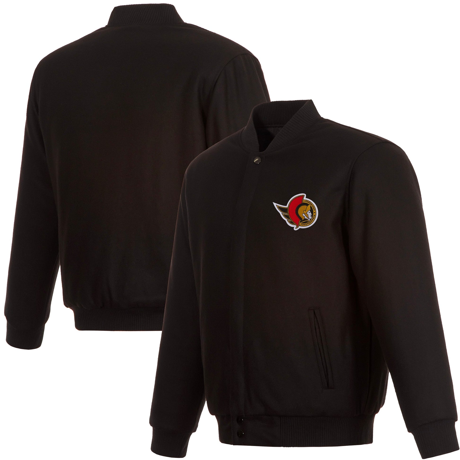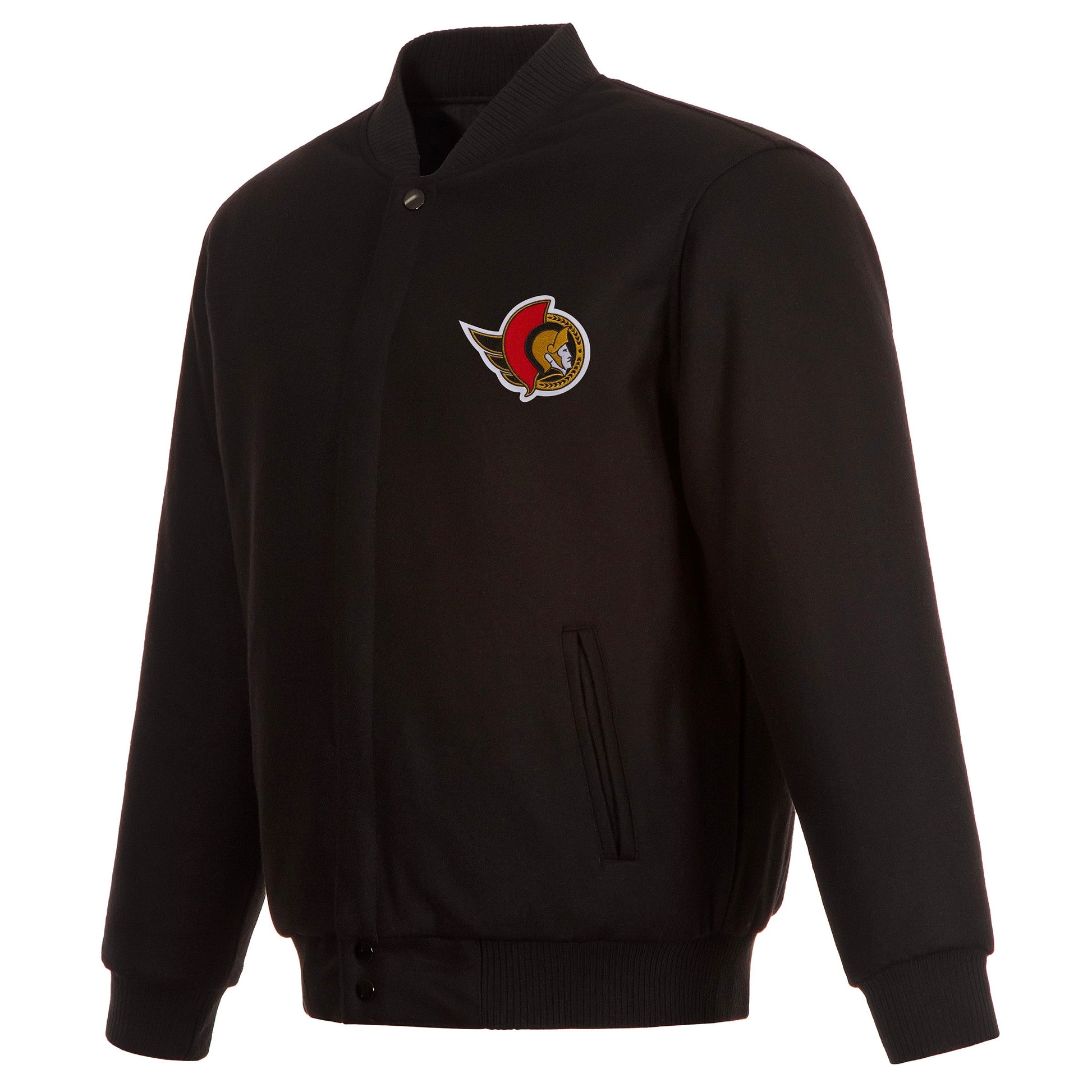 Ottawa Senators All Wool Jacket with nylon lining in royal and white with embroidered logos. Assembled in the USA. 55% wool 45% polyester body. Snap button closure.